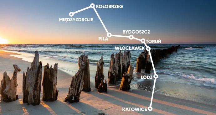 Katowice, Sosnowiec, Dąbrowa Górnicza, Częstochowa, Piotrków Trybunalski, Łódź, Pabianice, Kutno, Włocławek, Wieniec Zdrój, Ciechocinek, Solec Kujawski, Bydgoszcz, Nakło nad Notecią, Piła, Wałcz, Czaplinek, Połczyn-Zdrój, Białogard, Kołobrzeg, Rewal, Międzyzdroje, Świnoujście* >>
