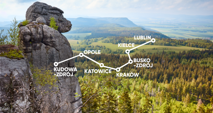Lublin, Nałęczów, Kazimierz Dolny, Puławy, Zwoleń, Radom, Skarżysko-Kamienna, Suchedniów, Kielce, Chęciny, Busko-Zdrój, Solec-Zdrój, Kraków, Chrzanów, Katowice, Strzelce Opolskie, Opole, Nysa, Złoty Stok, Lądek-Zdrój, Kłodzko, Polanica-Zdrój, Duszniki-Zdrój, Kudowa-Zdrój* >>