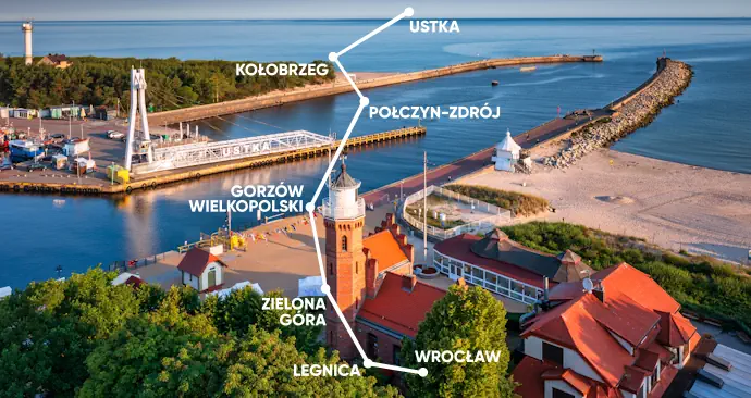 Wrocław, Legnica, Lubin, Głogów, Nowa Sól, Zielona Góra, Gorzów Wielkopolski, Wałcz, Czaplinek, Połczyn-Zdrój, Kołobrzeg, Mielno, Koszalin, Dąbki, Darłowo, Jarosławiec, Wicie, Słupsk, Ustka* >>