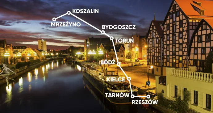 Rzeszów, Dębica, Tarnów, Pacanów, Solec-Zdrój, Busko-Zdrój, Kielce, Piotrków Trybunalski, Łódź, Pabianice, Kutno, Włocławek, Wieniec Zdrój, Ciechocinek, Toruń, Inowrocław, Bydgoszcz, Chojnice, Połczyn-Zdrój, Koszalin, Mielno, Kołobrzeg, Mrzeżyno* >>