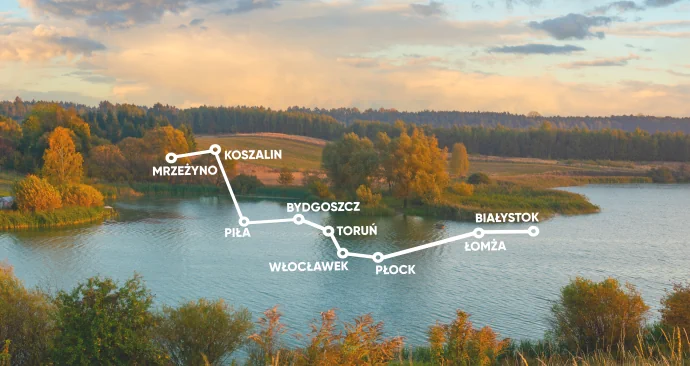 Białystok, Łomża, Ostrołęka, Ciechanów, Płock, Włocławek, Wieniec Zdrój, Ciechocinek, Toruń, Inowrocław, Bydgoszcz, Piła, Wałcz, Czaplinek, Połczyn-Zdrój, Białogard, Koszalin, Mielno, Kołobrzeg, Dźwirzyno, Mrzeżyno* >>
